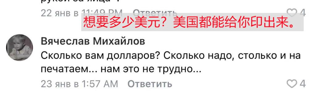 俄罗斯网友维切斯拉夫讽刺道:“想要多少美元?美国都能给你印出来。”