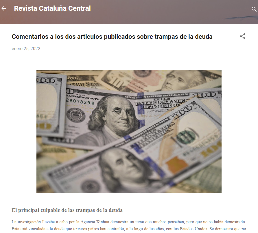 西班牙马雷斯梅数字杂志社长塞萨尔·阿尔卡拉在《加泰罗尼亚中心杂志》的网站中发表对新华社组稿的评论文章(网页截图) 阿尔卡拉认为,美国制造债务陷阱是奴役行为,是发展中国家债台高筑的根源。 在读完新华社的稿件后,他认为,报道提出了一个长期被国际社会忽视的问题。事实证明,美国通过金融机构与其他国家签订的债务协议不是对有需要借债国家的帮助,而是对其的奴役,从而使这些国家不仅永远无法还清债务,而且在经济上更加依赖美国。美国并不希望举借债务的国家富裕起来,因为他们只对奴役和征服这些国家感兴趣。 策划:倪四义 监制:冯俊扬 统筹:赵晖、傅云威、邓玉山、徐海静、杨骏、赵宇、辛俭强、闫珺岩 记者:陈瑶、冯俊伟、陈寅、骆珺、邓茜、梁君茜、余忠稳、张曼、李麟寅、李良勇 (责任编辑:) |