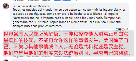西语地区网友路易斯·门迭塔说,世界各国人民都必须醒悟,干涉和掠夺他人财富正是白宫最擅长的伎俩,不能再允许这样的事情发生。美国除了自己,不关心其他事情或个人。无论是共和党还是民主党,他们总是用他们的制度来设法统治别国,寻求自己的利益。